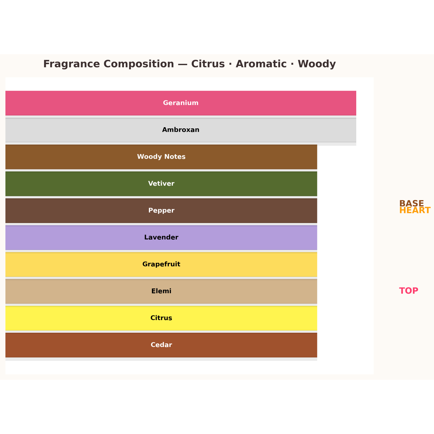 Męska woda perfumowana o cytrusowo-aromatycznym charakterze, łącząca świeżość grejpfruta i cytrusów z lawendą, geranium i pieprzem oraz męską bazą ambroksanu, cedru i wetywerii – idealna na co dzień i ciepłe pory roku
