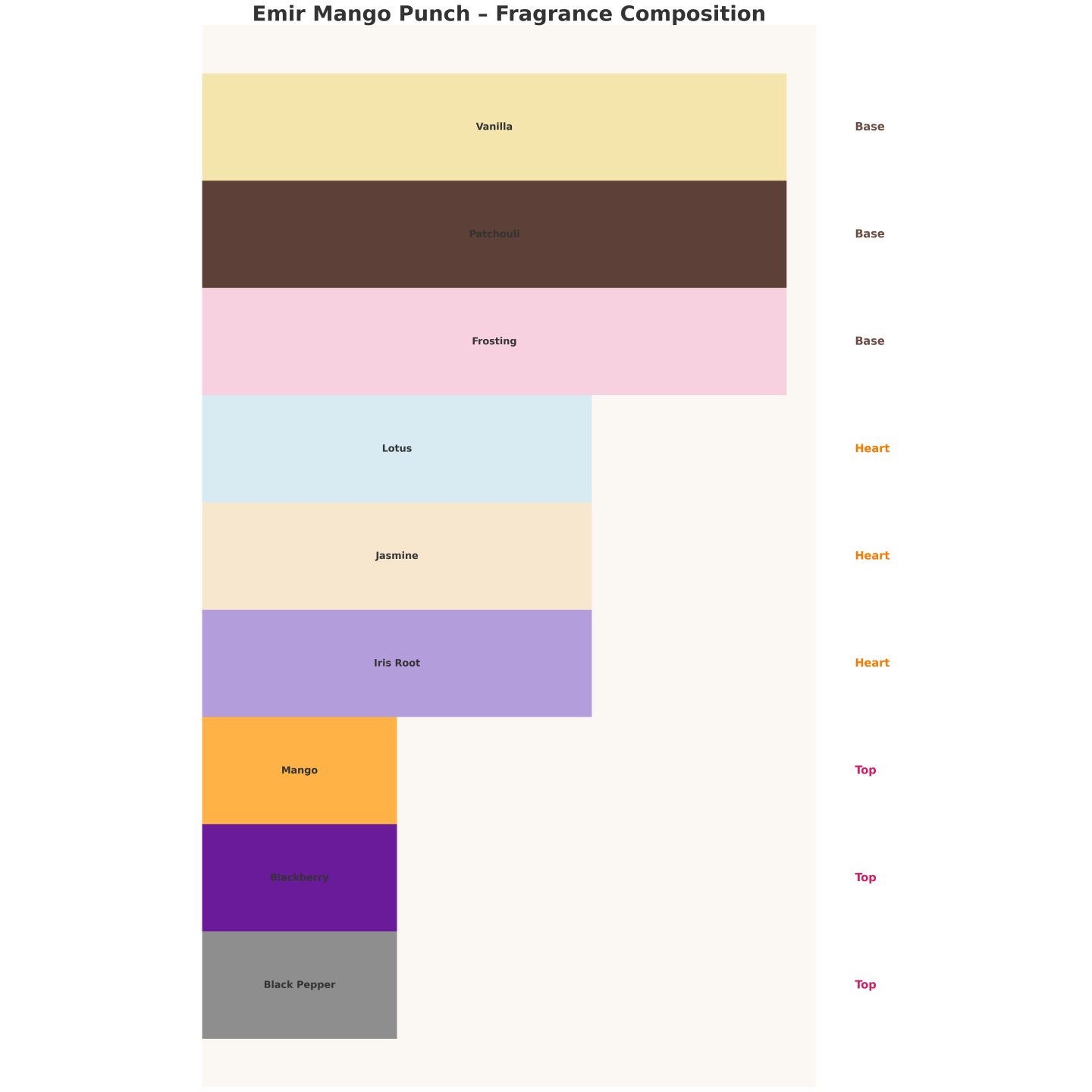 Emir Mango Punch ist ein Duft voller Energie und Frische – wie der erste Schluck eines tropischen Cocktails in der prallen Sonne. Er ist ein lebendiges, saftiges, fröhliches und zugleich elegantes Aroma, das die natürliche Süße von Früchten mit floraler Finesse und einer subtilen orientalischen Tiefe vereint. Diese Komposition wurde für alle kreiert, die lebendige Düfte lieben und ihre positive Energie jeden Tag unterstreichen möchten. Der Duft si mit einer Explosion aus Mango, süß-sauren Brombeeren und würzigem schwarzem Pfeffer und sorgt so für einen spritzigen, exotischen Auftakt, der sofort fesselt. Zarter Jasmin, cremige Iriswurzel und frische, aquatische Lotusblüte im Herzen verleihen der Komposition Leichtigkeit, Eleganz und florale Harmonie. Die Basisnote bietet eine einhüllende Mischung aus Vanille, Gourmand-Glasur und erdigem Patschuli, die dafür sorgt, dass der Duft stundenlang weich, samtig und unglaublich angenehm auf der Haut bleibt. Dieser Unisex-Duft wurde für energiegeladene Menschen geschaffen, die fruchtige, moderne und einzigartige Düfte schätzen.