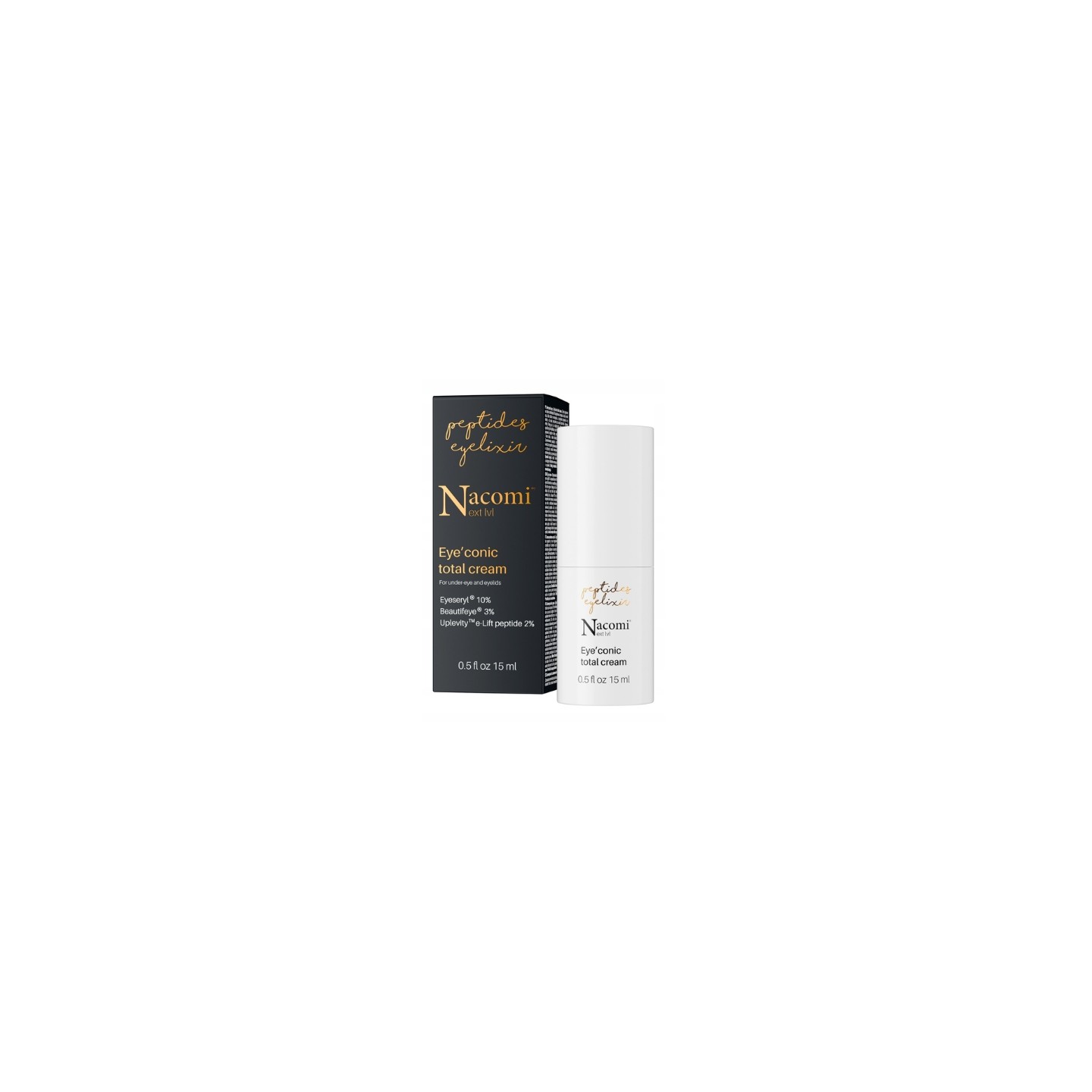 Die Eye'conic Total Cream ist eine umfassende Pflege für die empfindliche Hautpartie um die Augen. Sie vereint Anti-Falten-, Lifting-, Aufhellungs- und Anti-Abschwellungs-Wirkstoffe und sorgt so für einen sichtbar jüngeren Teint. Dank der Synergie biomimetischer Peptide, Ceramide und pflanzlicher Butter wirkt die Creme gezielt gegen Falten, Augenringe, Schwellungen, nachlassende Hautfestigkeit und eine geschwächte Hautbarriere. Sie ist ein wahrer „Augen-Elixier“ für alle, die sich schnelle und langanhaltende Ergebnisse wünschen – ein Lifting der Augenlider, weniger Tränensäcke, geglättete Krähenfüße und intensive Feuchtigkeitspflege.