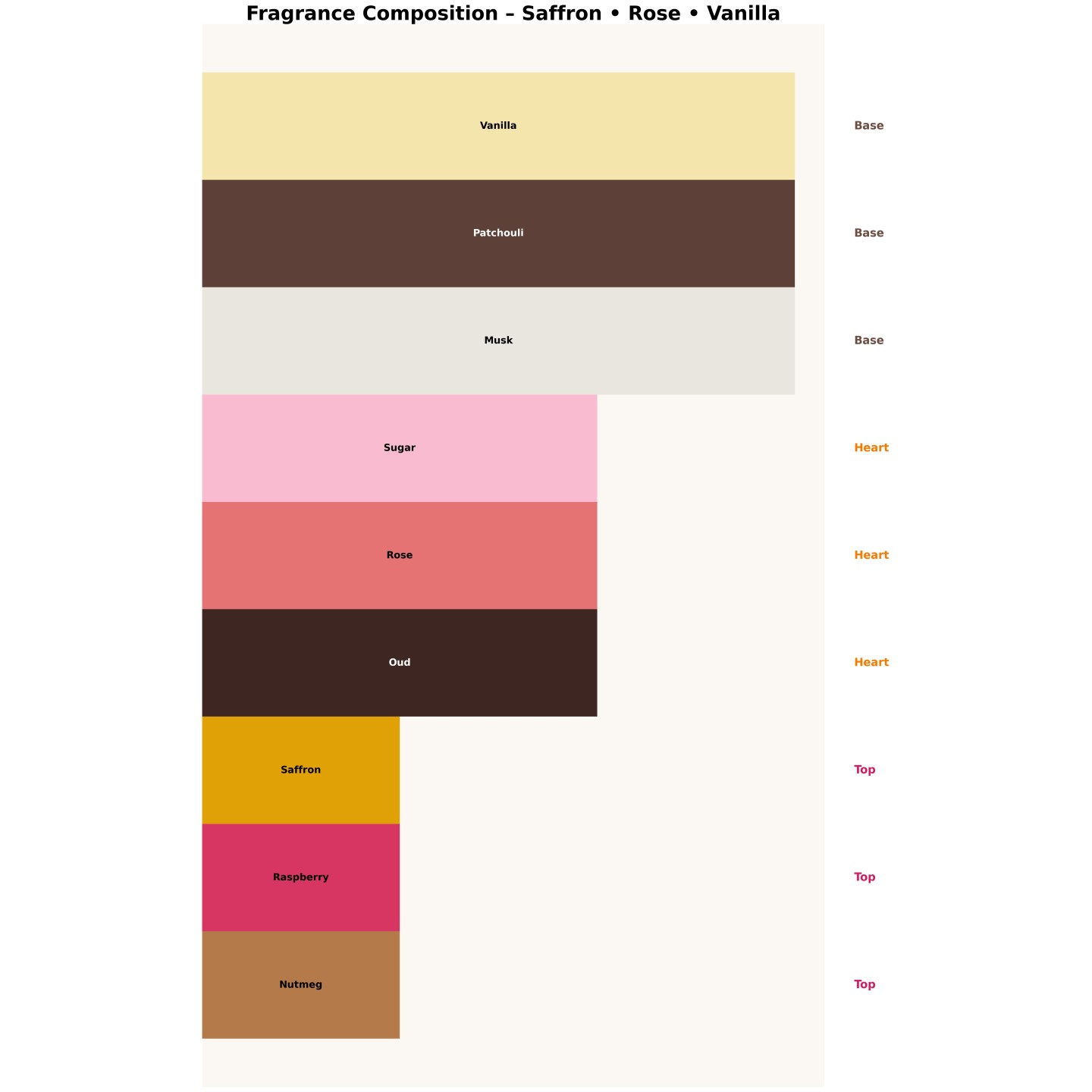 Chaleureux, oriental et doux – safran et framboise en tête, rose et oud en cœur, vanille et musc en fond.