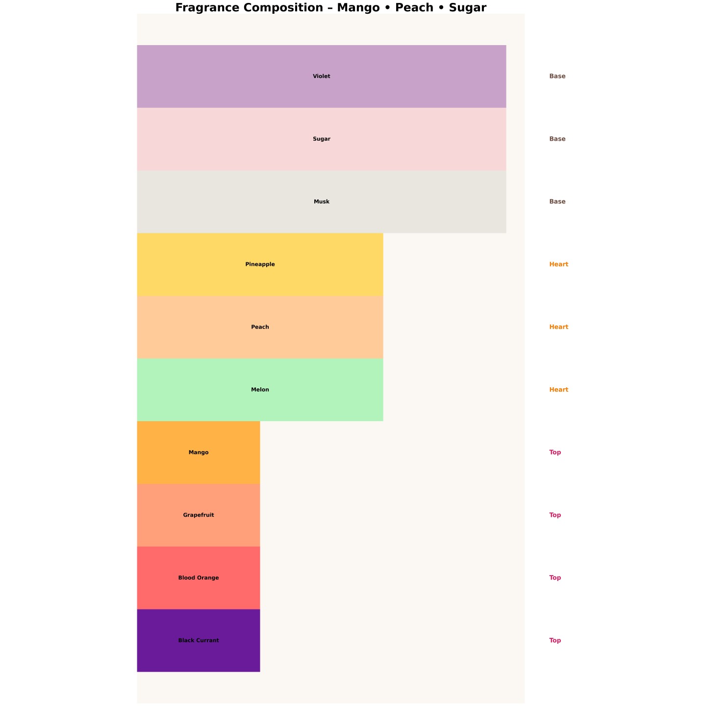 Mango Jugoso est un parfum qui incarne l'essence même de l'été : énergie, joie et plaisir fruité. Son arôme évoque les marchés exotiques, où flotte un parfum de fruits mûrs, de soleil et d'insouciance. Lancée en 2020, cette composition allie la fraîcheur tropicale à une élégance moderne et légère. L'ouverture est une véritable explosion de fruits : mangue juteuse, orange sanguine fraîche, pamplemousse et cassis légèrement acidulé créent un départ dynamique et énergisant. Un cocktail estival et sucré de pêche, melon et ananas si au cœur, conférant à la composition une profondeur tropicale onctueuse et une agréable fraîcheur. Le fond enveloppe la douceur délicate du sucre, un musc subtil et une touche de violette, pour un sillage légèrement poudré et élégant. Mango Jugoso est le parfum idéal pour celles et ceux qui aiment les compositions joyeuses et fruitées et qui souhaitent sentir bon, frais, sucré et unique.