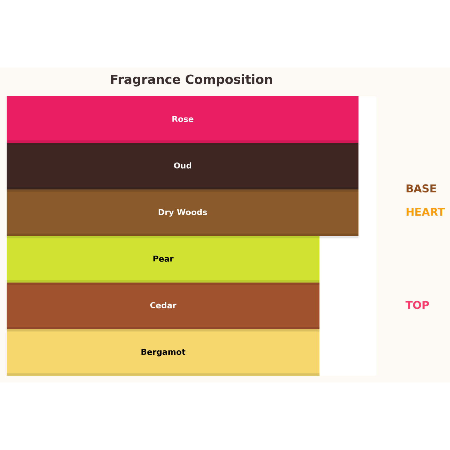 ✔ Le parfum est-il lourd ? Il possède un fond oriental-boisé distinctif, ale le départ frais et la rose apportent luminosité et équilibre.