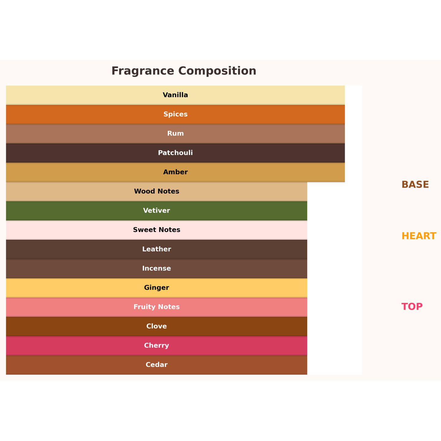 ✔ Notes de cœur : rhum, épices, gingembre, clou de girofle, cèdre, bois
