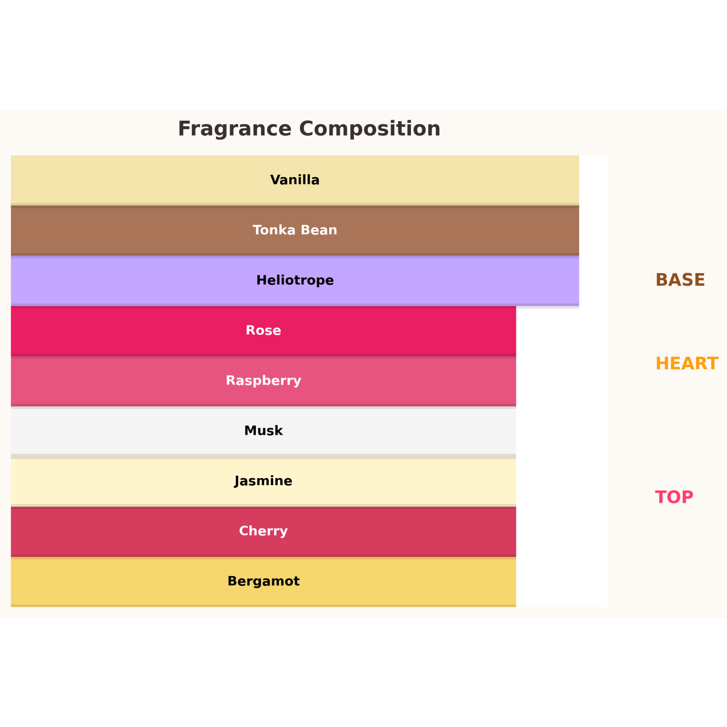Dès les premiers instants, Sweet Cherry Kiss enveloppe la peau d'un joyeux duo estival de cerises et de framboises, relevé par la fraîcheur de la bergamote. Un accord poudré d'héliotrope, de rose et de fleurs de jasmin en cœur apporte une touche féminine. Un fond de fève tonka, de vanille et de musc crée un sillage doux et sensuel. Un choix idéal pour le printemps et l'été : léger, frais et envoûtant grâce à son harmonie fruitée-florale.