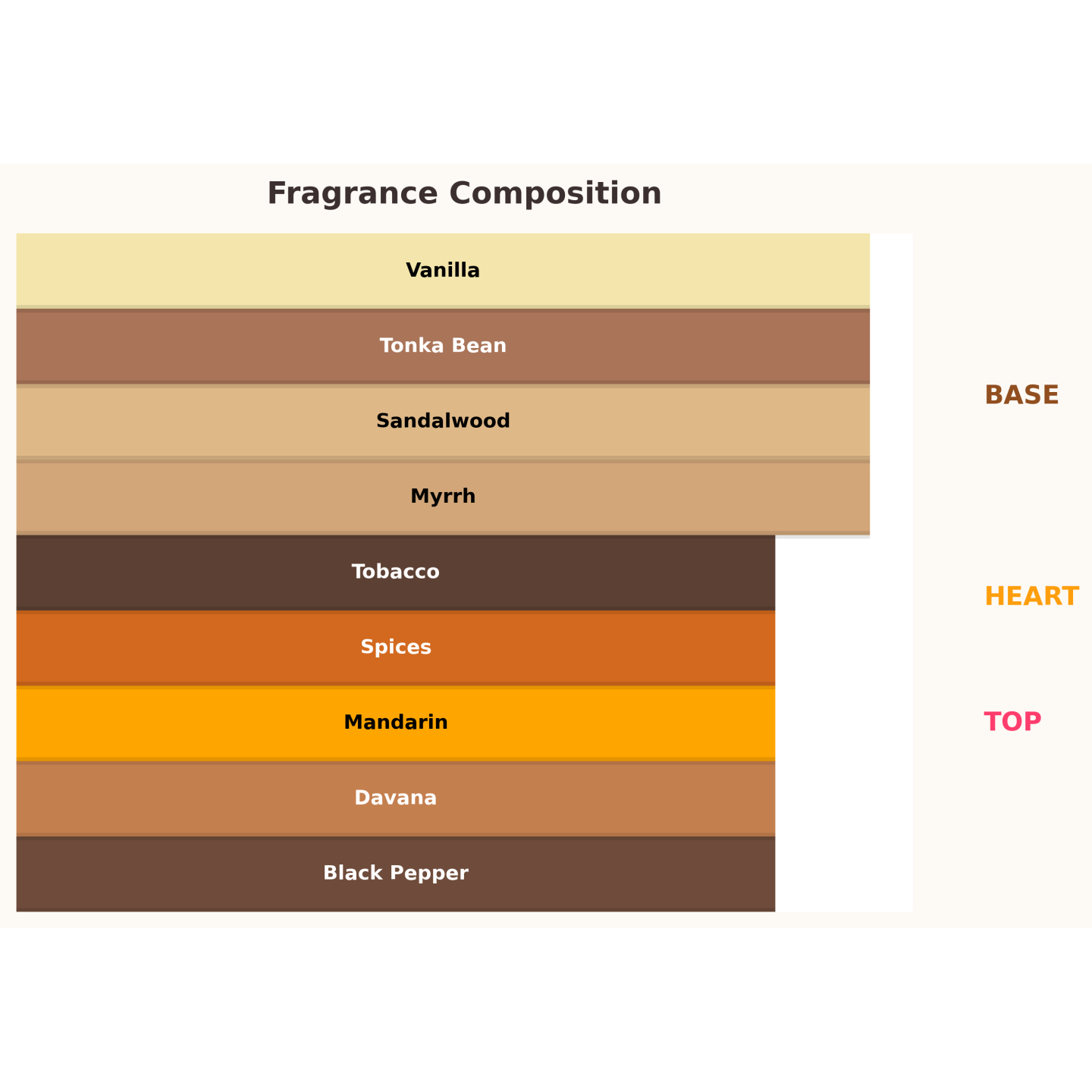 Sweet Heaven Tobacco s'ouvre si une vague chaude et épicée, où la mandarine lumineuse rencontre le davana sensuel et une touche herbacée. Après un instant, la composition s'épaissit : la myrrhe fumée se mêle au poivre noir épicé et au bois de santal crémeux, créant un cœur noble et élégant. Le final est un mélange velouté de fève tonka, de vanille et d'accords de tabac : un parfum chaleureux, addictif et persistant. Un parfum parfait pour les mois les plus froids, les soirées et toutes les occasions où vous souhaitez mettre en valeur votre charisme.