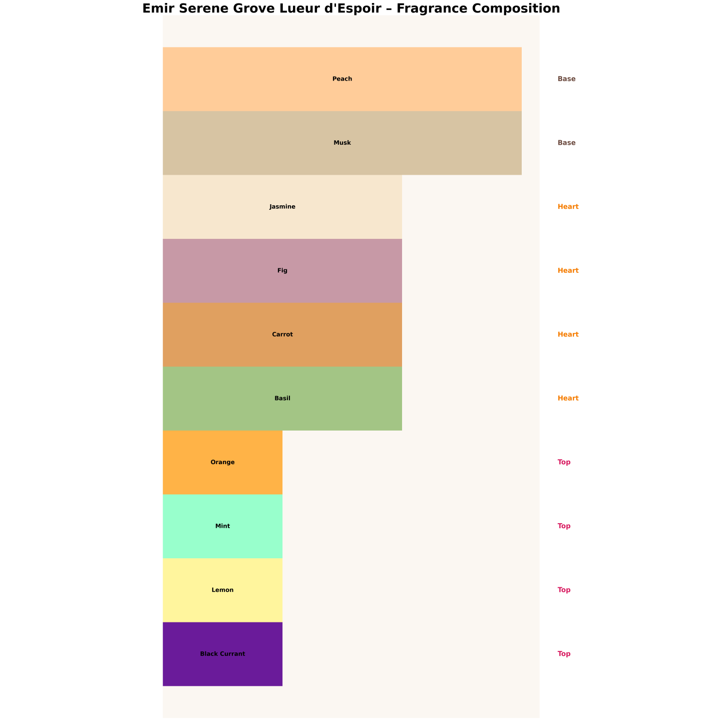 Emir Lueur d'Espoir Serene Grove est un parfum pour celles et ceux qui aiment commencer leur journée par une dose de fraîcheur, d'optimisme et d'équilibre aromatique. Cette composition a été créée pour celles et ceux qui apprécient le contact avec la nature, l'air pur et les accords énergisants d'agrumes et d'herbes. Léger et pourtant plein de caractère, il est parfait pour les beaux jours et un rythme de vie dynamique. L'ouverture séduit par une combinaison juteuse de cassis, de citron, d'orange et de menthe fraîche – une explosion de fraîcheur qui stimule et rafraîchit l'esprit. Au cœur de la composition, des notes vibrantes de basilic, de carotte douce et herbacée, de jasmin délicat et de figue crémeuse créent un accord aromatique et naturel d'une douce harmonie verte. Le fond est léger ale agréablement fruité : la pêche apporte du jus, tandis que le musc assure pureté, tenue et une sensualité subtile. Serene Grove est une composition pour les amoureux des parfums originaux, herbacés et hespéridés, qui dynamisent et inspirent l'action.
