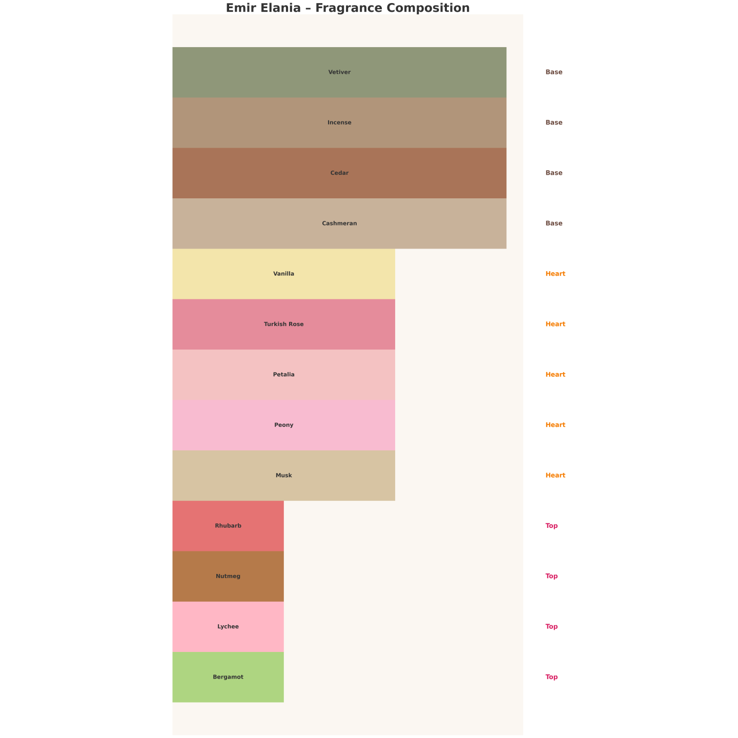 Emir Elania is a perfume that transports you to a royal garden bathed in sunlight – a place where the air is full of sweet fruit and majestic roses. This fragrance is created for the modern romantic: an elegant, confident woman, ale delicate and graceful. The composition si with the explosive freshness of lychee and the slightly tart, juicy rhubarb, accented by the light of bergamot and the spice of nutmeg. This accord is joyful, crisp, and immediately captivating. A truly royal pair blooms in the heart – Turkish rose and fluffy peony, which, with the help of musk, vanilla, and a modern note of petalia, create a velvety, feminine, and complementing heart of the composition. The base envelops the skin in an elegant, warm haze of cashmere wood, noble cedar, earthy vetiver, and subtle incense, lending the composition longevity, sensuality, and sophistication. Emir Elania is a fragrance that surprises, pampers, and leaves a beautiful, feminine trail behind. This is a perfume for those who love to feel like the best version of themselves.
