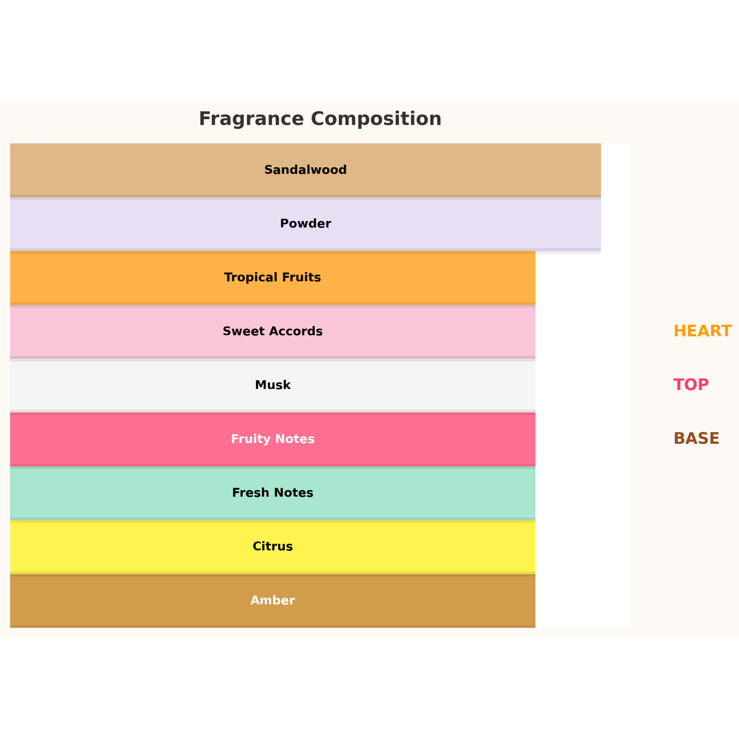 ✔ Top: fruitige noten, zoete akkoorden, muskus