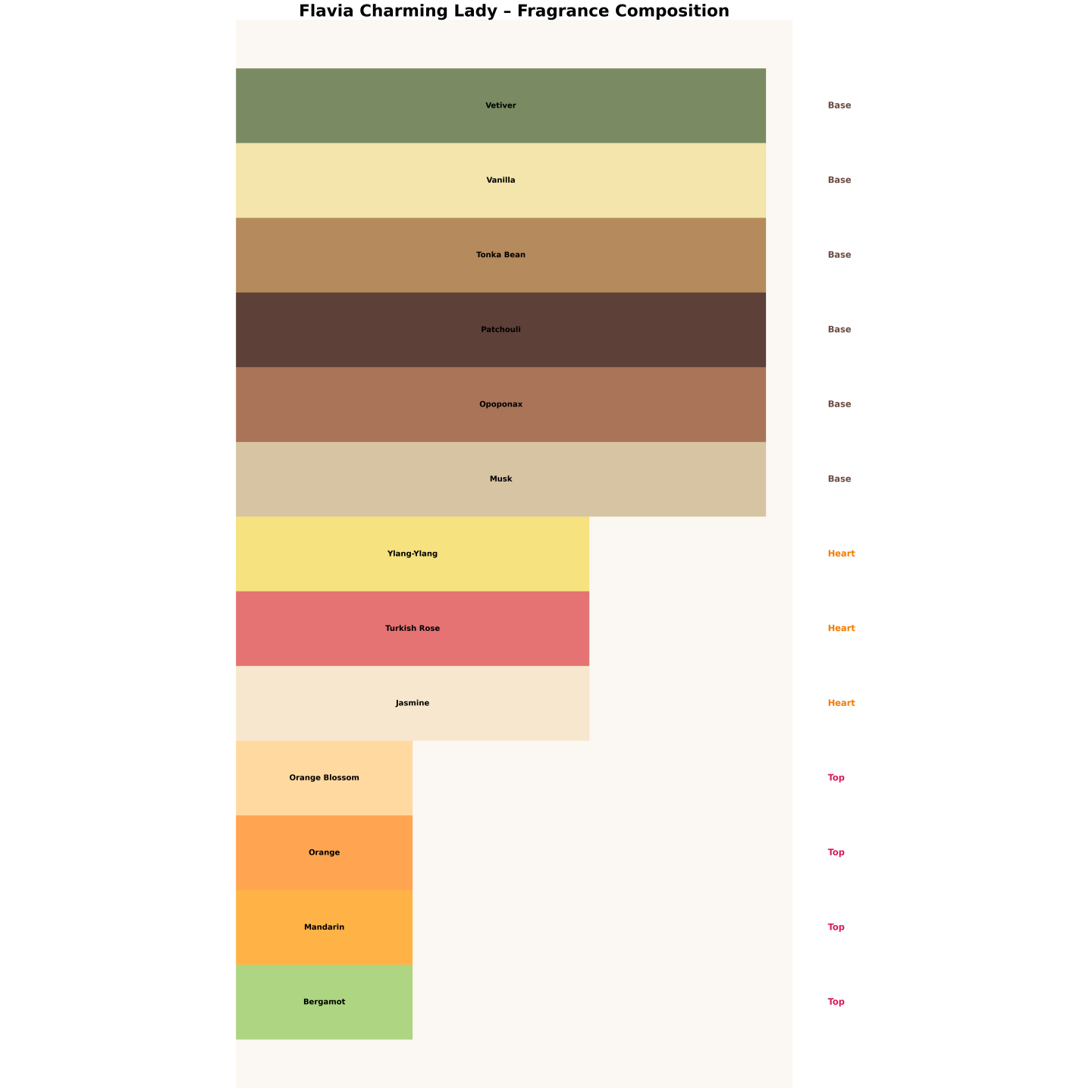 Charming Lady is een geur voor een vrouw met klasse, gratie en subtiele elegantie. De compositie is gecreëerd om te charmeren – zacht ale effectief. Het is een aroma dat omhult als een zachte nevel van frisheid, om even later te verrassen met een rijk, sensueel hart en een oriëntaalse, romige basis. De geur viert vrouwelijkheid in haar mooiste, meest harmonieuze vorm. De opening bestaat uit zachte en subtiele citrusnoten: oranjebloesem, bergamot, sinaasappel en mandarijn, die niet explosief van energie zijn, maar omhullen in een delicate, pastelkleurige gloed. Het hart si een exotisch duo van ylang-ylang en jasmijn, aangevuld met Turkse roos – een elegant, licht romantisch en bedwelmend boeket. De basis is warm, romig en uitgesproken oriëntaals: tonkaboon, zoete opoponax, zachte vanille, sensuele musk, patchouli en vetiver, die de compositie diepte, een lange houdbaarheid en een luxueus karakter geven. Het proefmonster van 10 ml heeft de perfecte inhoud om een vergelijkbaar intense, elegante geur te ervaren, of om mee te nemen op reis, in je handtas of make-uptas.