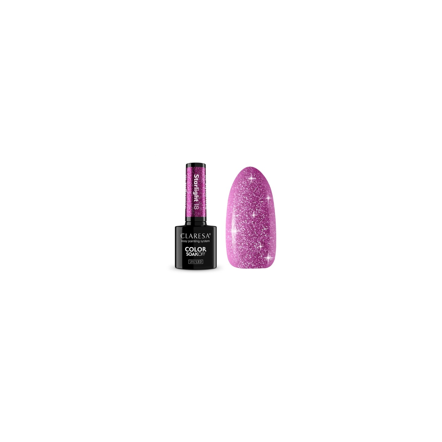 Breng een laagje basecoat aan op een ontvette nagelplaat en laat dit minimaal 60 seconden uitharden onder een UV/ LED lamp. Breng Starlight 18 aan op de uitgeharde basecoat en laat dit uitharden (breng indien nodig een tweede laagje aan). Fixeer het ontwerp met Claresa TOP COAT en laat dit minimaal 60 seconden uitharden onder een UV/LED-lamp.