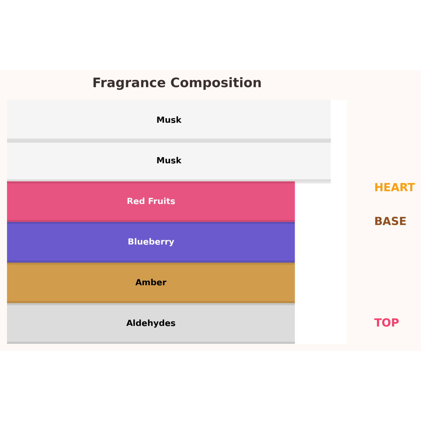 Deze eau de parfum voor dames combineert de lichtheid van de ochtend met de behaaglijke warmte van de late namiddag. De eerste seconden worden verlicht door een vleugje aldehyde, dat de neus streelt en een gevoel van puurheid en luchtige lichtheid geeft. Even later transformeert de geur in sappig bosfruit – voornamelijk bosbessen en rood fruit – waarvan de natuurlijke zoetheid harmonieus samengaat met de omhullende musk. Een basis van musk en amber verwarmt de huid aangenaam en laat een sensuele maar subtiele geur achter. Dit is de perfecte keuze voor de lente en zomer, wanneer u zich de hele dag fris, licht en elegant wilt si .