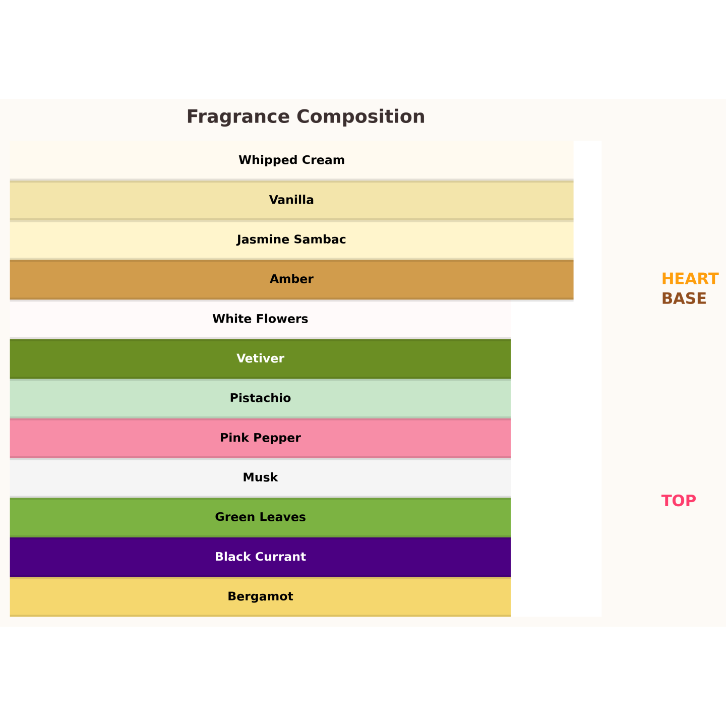 ✔ Basisnoten: slagroom, vanille, vetiver, musk