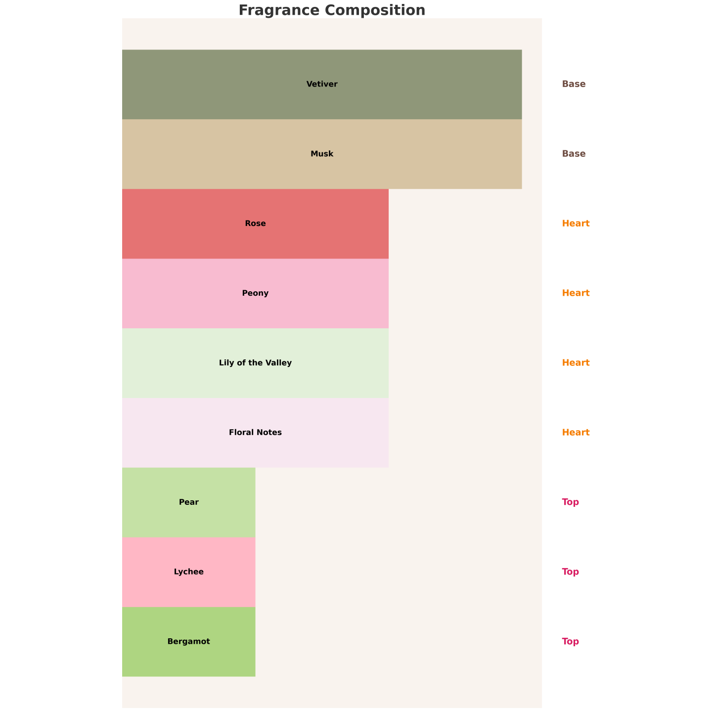 Свіжий та елегантний: фруктовий початок з бергамоту, лічі та груші перетворюється на квіткове серце з троянди, конвалії та півонії, все це огортається м'яким мускусно-деревним акордом.