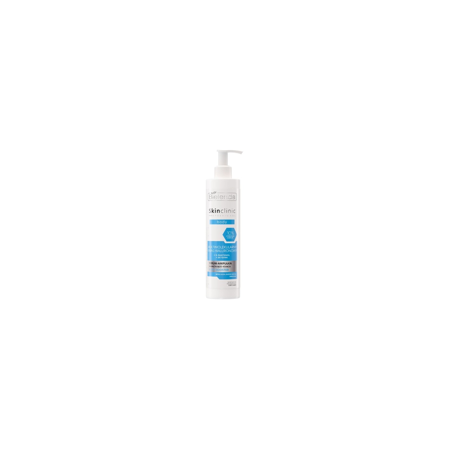 Bielenda Skin Clinic Professional зволожувальна та заспокійлива ампульна сироватка Body Bielenda Skin Clinic з мультимолекулярною гіалуроновою кислотою – це передовий косметичний засіб, натхненний салонними процедурами, створений для шкіри, яка потребує інтенсивного зволоження та заспокоєння. Формула, що базується на 10% комплексі Hydracalm, діє багаторівнево завдяки трьом формам гіалуронової кислоти, які зволожують шкіру на різних рівнях. Це si шкіру більш еластичною, пружною та помітно гладенькою. Крім того, D-пантенол та ектоїн сприяють регенерації та мають заспокійливу дію, зменшуючи подразнення та зміцнюючи природний захисний бар'єр шкіри. Сироватка приносить негайне полегшення та покращує комфорт навіть дуже сухої та чутливої шкіри. Легка, швидко поглинаюча формула робить продукт ідеальним для щоденного догляду, особливо після купання, видалення волосся або перебування на сонці.