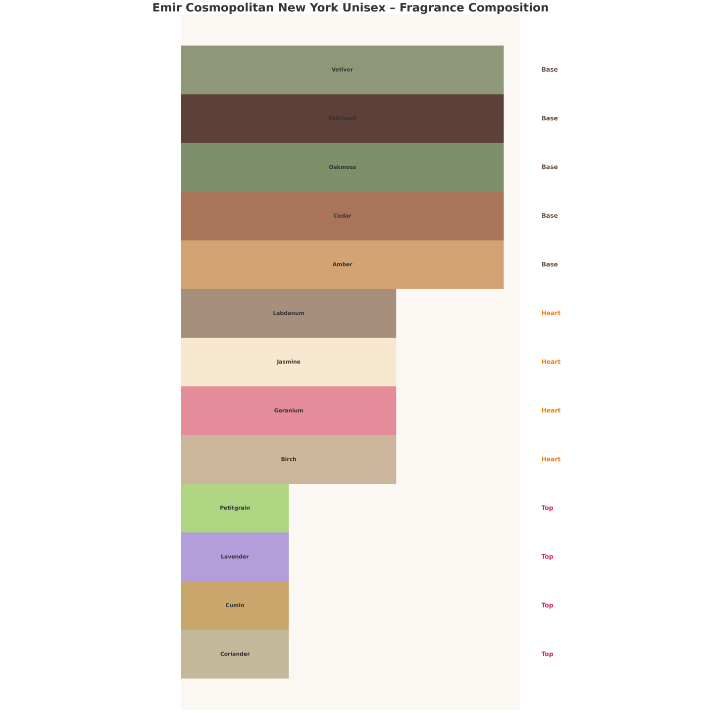 Emir Cosmopolitan New York – це ольфакторна ода місту, де кожен день – це нова історія, а кожна вулиця пульсує своїм власним ритмом. Це смілива, різноманітна та енергійна композиція, яка ідеально передає напруженість Нью-Йорка. Ця парфумерна вода втілює енергію Манхеттена, художній дух Брукліна та таємничу дикість Центрального парку після настання темряви. Верхні ноти нагадують прохолодний ранковий бриз на 5-й авеню: коріандр, кмин, сухий петитгрейн та ароматна лаванда створюють свіжий, елегантний та злегка пряний вступ. У серці аромату si смолисті та квіткові акценти: лабданум, береза, чуттєвий жасмин та зелена герань, що надають композиції деревно-квіткової глибини та нью-йоркської різноманітності. База огортає теплом амбри, а кедр, ветивер, пачулі та дубовий мох створюють елегантний, землистий та стійкий шлейф – немов нічна прогулянка Центральним парком під світлом ліхтарів. Флакон, прикрашений зображенням Статуї Свободи, підкреслює сміливість, свободу та міський дух цієї композиції. Його золотистий колір та сучасний дизайн роблять його родзинкою будь-якої колекції парфумів. Цей аромат призначений для енергійних, відкритих, креативних та впевнених у собі людей. Ідеально підходить для прохолодних днів, міських прогулянок, ділових зустрічей, побачень та подій, коли ви хочете виразити свій стиль та харизму.