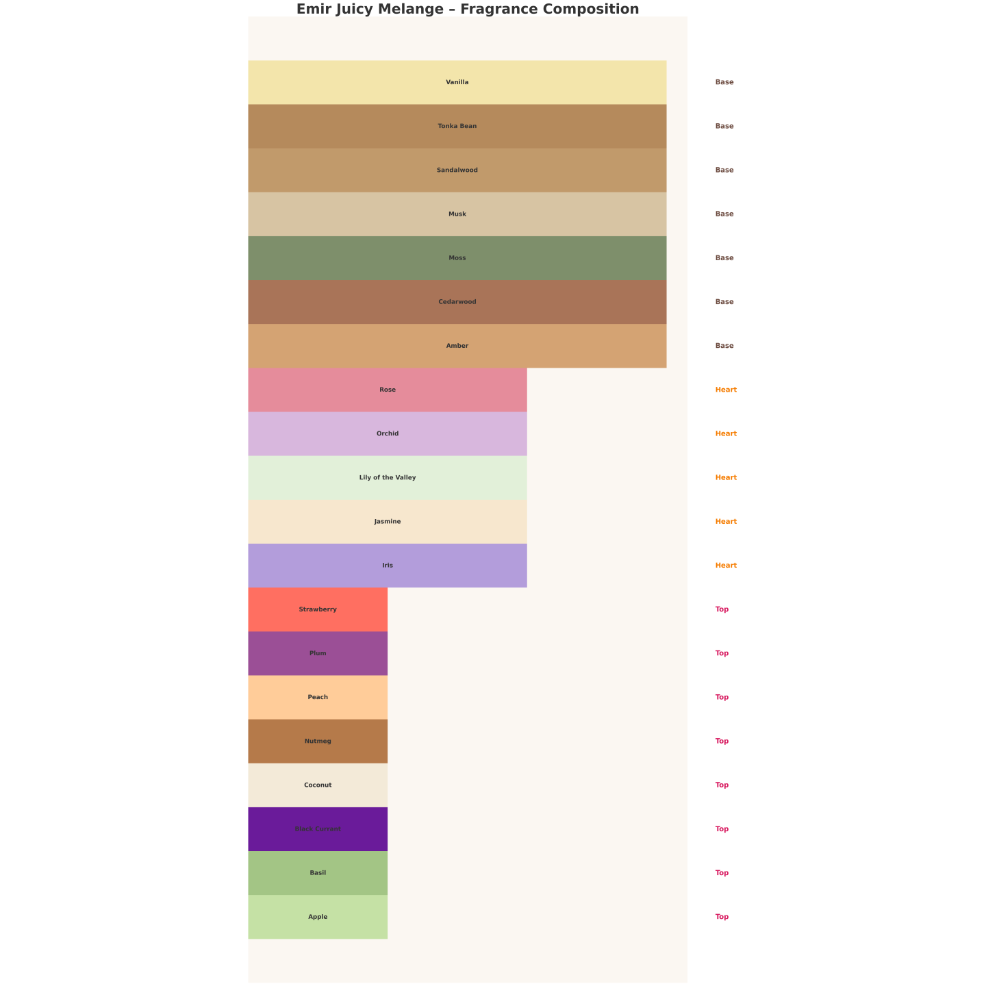 ✔ Верхні ноти: Полуниця, Чорна смородина, Слива, Персик, Кокос, Яблуко, Мускатний горіх, Базилік