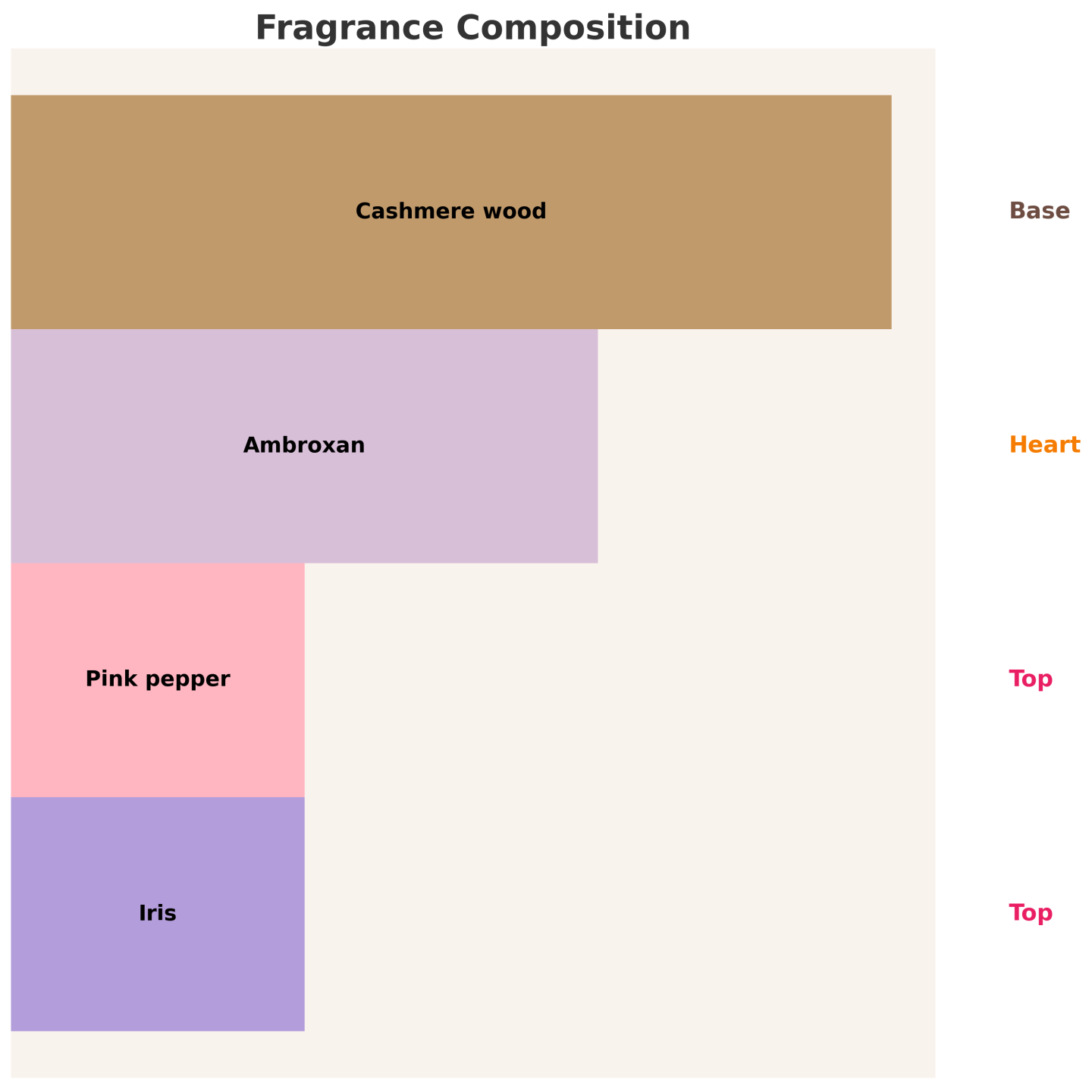Сучасний, чистий та мінімалістичний: ірис та рожевий перець у верхніх нотах, амброксан у серці, кашемірове дерево в базі.