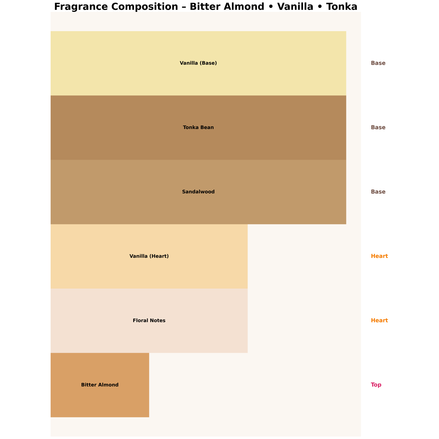 Гіркий мигдаль у початкових нотах, кремова ваніль у серці та глибока, оксамитова база з тонка та сандалового дерева.